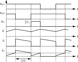 當(dāng)原邊開關(guān)管S1及S2均開通時,能量儲存在輸入濾波電感中,同時輸出整流管處于關(guān)斷態(tài)。當(dāng)開關(guān)管S1及S2中任一個開關(guān)管關(guān)斷時,儲存能量通過原邊繞組傳輸?shù)礁边?。由于變換器的對稱工作,變壓器磁通得以復(fù)位平衡。