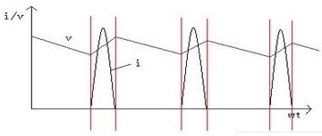 一般開(kāi)關(guān)電源為容式濾波,在輸入與整流濾波部分電磁噪聲主要是由整流過(guò)程中造成的電流尖峰、電壓波動(dòng)所引起的。正弦波電源經(jīng)過(guò)電源濾波器進(jìn)行差模、共模信號(hào)衰減后,由整流橋整流、電解電容濾波,得到的電壓作為高頻逆變部分的輸入電壓。由于濾波電容的存在,使整流器不象純整流那樣一組開(kāi)通半個(gè)周期,而是只在正弦電壓高于電容電壓時(shí)才導(dǎo)通,造成電流波形非常陡峭,同時(shí)電壓波形變得平緩。電流、電壓的波形如圖2所示。