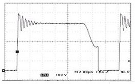 相對(duì)于一般的反激式變換器,準(zhǔn)諧振只在原來(lái)電路基礎(chǔ)上加了一個(gè)無(wú)源器件電容器,不會(huì)在電路中產(chǎn)生多余的電磁噪聲。通過(guò)改變控制方式,利用變壓器初級(jí)電感與電容器之間發(fā)生諧振,在開(kāi)關(guān)管電壓波形出現(xiàn)波谷處開(kāi)通;關(guān)斷時(shí)利用電容器進(jìn)行緩沖,可以大大降低開(kāi)關(guān)管上的關(guān)斷電壓尖峰和開(kāi)通電流尖峰,從而降低電磁干擾。利用安森美的NCP1207制作的準(zhǔn)諧振反激式開(kāi)關(guān)電源,其開(kāi)關(guān)管上的電壓波形如圖6所示: