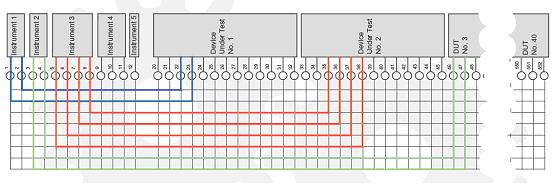 可以選擇另一種方式對(duì)矩陣進(jìn)行配置,這種方式可以得到更為高效,并且Pickering公司的BRIC也非常適用在這種方式中。前面提到的矩陣構(gòu)成方式是,將測(cè)試裝置和Y向進(jìn)行連接,將待測(cè)設(shè)備的接入點(diǎn)和X向進(jìn)行連接,下面我們采用另一種方式重新對(duì)矩陣進(jìn)行排列,將所有的測(cè)試裝置以及待測(cè)設(shè)備的接入點(diǎn)都和X軸向進(jìn)行連接。而Y軸則是將X軸方向上的不同設(shè)備進(jìn)行相互連接。盡管在許多應(yīng)用中,如果PXI的前面板上有需要的話,Y軸是可用的,但是Y軸的輸出并沒(méi)有用到。