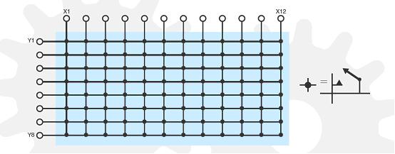 實(shí)現(xiàn)開(kāi)關(guān)切換的一個(gè)比較通用的方法就是采用交叉點(diǎn)開(kāi)關(guān)或矩陣排列來(lái)實(shí)現(xiàn)。在矩陣開(kāi)關(guān)中,一系列的橫向(X軸方向)和縱向(Y軸方向)線路在每個(gè)交叉點(diǎn)上相互連接著。開(kāi)關(guān)最簡(jiǎn)單的結(jié)構(gòu)是,在通常的狀態(tài)下是常開(kāi)的,而在上電后則斷開(kāi)連接,形成閉合狀態(tài),但是,也可能存在其他的結(jié)構(gòu)。開(kāi)關(guān)允許矩陣中任何橫向線路與縱向線路在任意點(diǎn)的連接。
