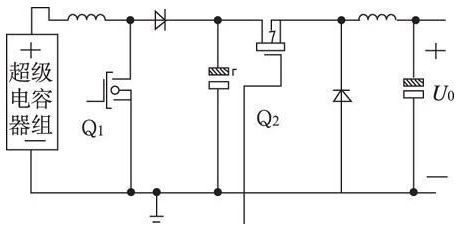 由于光伏陣列受外界環(huán)境影響較大, 本系統(tǒng)中12 V的太陽能板輸出電壓的變化范圍約為0~ 20 V,如果直接為鉛酸蓄電池充電, 由于鉛酸蓄電池的正常工作電壓要高于10. 8 V, 因此當(dāng)弱光條件下, 太陽能板的輸出電壓低于鉛酸蓄電池的端電壓時, 其產(chǎn)生的電能不能被鉛酸蓄電池吸收。因此本系統(tǒng)采用把太陽能板輸出經(jīng)過超級電容器組, 再由超級電容器組先經(jīng)升降壓后為鉛酸蓄電池充電, 有效增強(qiáng)系統(tǒng)弱光充電能力, 提高利用效率。