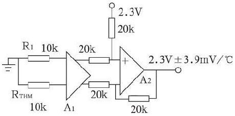 UC3909 內(nèi)部集成了具有鉛酸蓄電池溫度補(bǔ)償功能的電路如圖4 所示, A1 為電流/ 電壓轉(zhuǎn)換元件, 其輸入端分別接10 kΩ 普通電阻及10 k Ω 熱敏電阻。A2 與外接四個20 kΩ 電阻組成差動運(yùn)算放大電路。RT HM 一般貼附在鉛酸蓄電池的表面殼體用于檢測其溫度, 當(dāng)鉛酸蓄電池內(nèi)部溫度變化時, 通過熱敏電阻RTHM 的反饋使U C3909 的基準(zhǔn)電壓2. 3 V 也隨溫度按- 3. 9 mV/℃ 的溫度系數(shù)變化。從而確保鉛酸蓄電池在浮充狀態(tài)下準(zhǔn)確工作于安全的浮充電壓, 保護(hù)了鉛酸蓄電池。