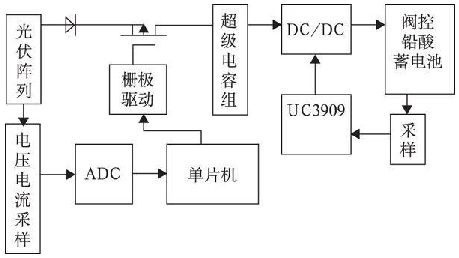 圖2 所示為基于U C3909 太陽能蓄電池充電器電路框圖, 光伏陣列經(jīng)過電壓電流采樣再經(jīng)模數(shù)轉(zhuǎn)換將數(shù)字信號反饋至單片機(jī), 單片機(jī)根據(jù)光伏陣列的工作狀況輸出PWM 信號去驅(qū)動PMOS 管, 實(shí)現(xiàn)對光伏陣列的最大功率跟蹤。超級電容器組、DC/ DC 變換器、UC3909 用來實(shí)現(xiàn)對閥控鉛酸蓄電池的四階段充電控制, 并利用超級電容的特性優(yōu)化充放電過程。本文側(cè)重對超級電容器組、U C3909 及DC/ DC 變換器等部分實(shí)現(xiàn)對閥控鉛酸蓄電池四階段的充電分析及設(shè)計(jì)。