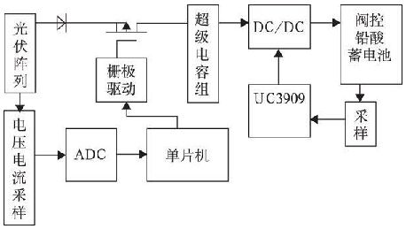 本系統(tǒng)采用超級電容器組與鉛酸蓄電池做太陽能路燈照明系統(tǒng)混合儲能元件, 利用超級電容器組及升降壓電路實(shí)現(xiàn)弱光充電功能, 有效提高太陽能板利用率。同時利用U C3909 實(shí)現(xiàn)鉛酸蓄電池的四階段充電管理, 延長了蓄電池使用壽命, 提高系統(tǒng)穩(wěn)定性及使用效率。