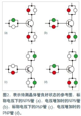 圖1中的簡(jiǎn)單晶體管測(cè)試儀可以判斷出晶體管的類型,并且能幫助檢測(cè)出晶體管的發(fā)射極、集電極和基極。其方法是檢查被測(cè)晶體管三個(gè)端子T1、T2和T3之間流過(guò)的各種可能電流方向的組合。