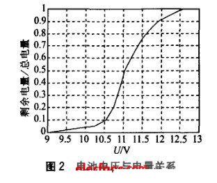 系統(tǒng)工作時間與電池電量成線性關(guān)系, 而電量與電池端電壓為非線性關(guān)系。圖2 所示為本系統(tǒng)所用電池在2 000 mA 恒流放電的情況下, 電池端電壓與電量的關(guān)系曲線, 其中橫軸為電池電壓, 縱軸為剩余電量相對于總電量的百分比。根據(jù)此曲線, 在MCU 軟件中擬合一個電壓與電量關(guān)系的數(shù)據(jù)表, 同時設(shè)置10 V為告警電壓; 系統(tǒng)可以實時查詢諸如電池電壓、電流、剩余電量、估計供電時間等信息, 并同時仿手機做成3段式顯示, 使上位機全面掌握電池狀態(tài),決定控制策略, 從而提高系統(tǒng)運行可靠性。MCU 軟件使用KeiluV2 軟件開發(fā), 上位機軟件使用LabWindow s 軟件開發(fā)。MCU 除完成電量查詢相關(guān)功能, 還要完成報警與顯示功能; 上位機軟件同時要完成環(huán)境參數(shù)的相關(guān)采集與處理。