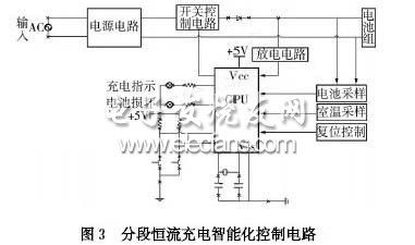 分段恒流充電智能化控制電路如圖3 所示。該電路采用CPU 控制,可對充電電池和充電環(huán)境溫度進行檢測,對電池充電進行計時,采樣充電過程中電池的電壓和電流,對分段恒流充電過程進行控制。