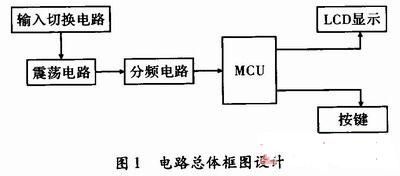 如圖1所示??驁D包括輸入切換部分、振蕩部分、分頻部分、單片機(jī)部分、顯示部分和鍵盤部分。此系統(tǒng)由STC89C51單片機(jī)作為控制核心,輸入切換部分采用雙刀雙擲繼電器完成待測電容或電感的線路切換,振蕩電路工作在放大諧振狀態(tài),頻率有高頻管9018的集電極輸出,由于頻率較高,所以需經(jīng)過信號分頻,再者由于輸出的電壓幅度大,此處無需再加一級驅(qū)動(dòng),以74LS393數(shù)字分頻芯片,把分頻端級聯(lián)實(shí)現(xiàn)100分頻,最終信號進(jìn)入單片機(jī),由單片機(jī)計(jì)算出頻率,經(jīng)過算法設(shè)計(jì),實(shí)現(xiàn)未知電容或電感參數(shù)的測定。圖1給出了系統(tǒng)的總體框架圖。