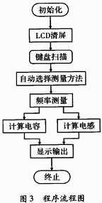 系統(tǒng)上電初始化并且清屏,單片機(jī)初始化完成后,進(jìn)入鍵盤掃描程序,當(dāng)要進(jìn)行電容或電感測量時(shí),選擇測量按鍵,系統(tǒng)進(jìn)行自動(dòng)判斷并進(jìn)行電容或電感的測量。當(dāng)判斷為電容時(shí),系統(tǒng)選擇電容的計(jì)算方法。當(dāng)判斷為電感時(shí),系統(tǒng)選擇電感的計(jì)算方法。計(jì)算完成后在液晶屏上顯示測量結(jié)果。下面是具體的程序流程圖,如圖3所示。