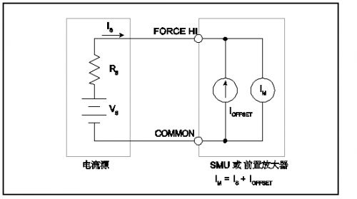 對于理想的安培計,當其輸入端子保持開路時,其讀數(shù)應為零。然而,現(xiàn)實中的安培計在輸入開路時確實存在小電流。這一電流被稱為輸入偏移電流,是由于有源器件的偏置電流以及流過儀器中絕緣體的漏泄電流產(chǎn)生的。SMU內產(chǎn)生的偏移電流已包括在吉時利4200-SCS型的技術指標中。如圖1所示,輸入偏移電流增加至被測電流,所以儀表測量的是兩個電流之和。