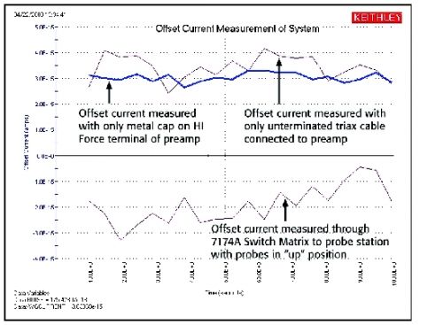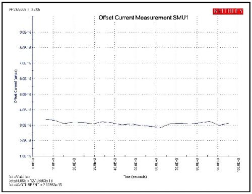 確定了安培計的偏移電流后,將系統(tǒng)的其余部分逐步添加至測試電路,通過重復電流(0V)和時間圖,驗證系統(tǒng)其余部分的偏移(利用圖3中所示的“Append Run”按鈕)。最后,在“up”位置對探針末端或未連接器件的測試夾具進行測量。該過程將有助于確定任何故障點,例如短路的電纜或測量電路中的不穩(wěn)定性。然而,要意識到,連接和斷開電纜都會在電路中產(chǎn)生電流。為了進行超低電流測量,可能有必要在改變測試電路的連接后等待幾分鐘至幾個小時,使雜散電流衰減。圖4中的圖形顯示的是以下條件下的偏移:1)SMU的Force HI端子上戴有金屬帽;2)前置放大器上僅連接一根三軸電纜;3)通過吉時利7174A型小電流開關矩陣至探針臺,“up”位置有一個探針。