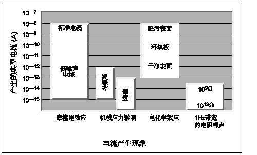 確定了電流偏移、漏流及所有不穩(wěn)定性后,采取措施減小測量誤差將有助于提高測量準確度。這些誤差源包括建立時間不足、靜電干擾、漏泄電流、摩擦效應、壓電效應、污染、濕度、接地環(huán)路,以及源阻抗。圖5中匯總了本節(jié)討論的部分電流的幅值。