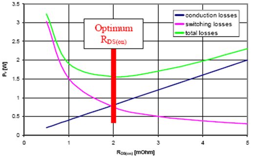 當(dāng)RDS(on)在1毫歐姆至3毫歐姆范圍內(nèi)時,總功耗始終大致相同。但是,在1毫歐姆以下,RDS(on)僅下降0.5毫歐姆,便會令總功耗提高一倍,從而嚴(yán)重降低電源轉(zhuǎn)換器的效率。