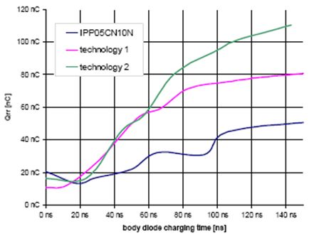 對于優(yōu)化能效,MOSFET內(nèi)部的體二極管具有關(guān)鍵作用。在每個開關(guān)循環(huán)中,在MOSFET被關(guān)斷之前,體二極管通常會通電,反向恢復(fù)電荷Qrr*也由此積聚起來。在第3節(jié)中已經(jīng)提到,數(shù)據(jù)手冊中所載Qrr與實(shí)際Qrr*有所出入。數(shù)據(jù)手冊中的值是按di/dt為100 A/μs測得的,二極管被施以最高漏極電流,并且MOSFET關(guān)斷前的導(dǎo)通時間長達(dá)500 μs左右甚至更長。因此,所測得的值是盡可能最高的Qrr*。此外,JEDEC標(biāo)準(zhǔn)所規(guī)定的測定方法不僅包含了Qrr*,而且包含MOSFET的部分輸出電荷,因而得到的總值很高,與實(shí)際值不相符。需要強(qiáng)調(diào)的是,雖然在實(shí)際應(yīng)用中,di/dt可能高達(dá)1000 A/μs,并且di/dt越高,Qrr*也越高。但是,Qrr*主要取決于電流和二極管導(dǎo)通時間。由于在實(shí)際應(yīng)用中,電流僅為最高漏極電流的一半甚或更低,并且二極管導(dǎo)通時間僅為50 ns至150 ns,因此實(shí)際Qrr*值比數(shù)據(jù)手冊中的值低得多。