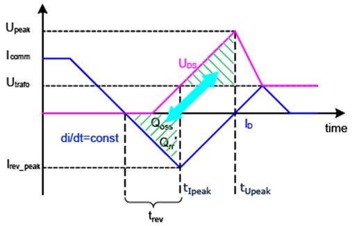點(diǎn)2時,MOSFET通道關(guān)斷,然而,在輸出扼流圈的驅(qū)動下,電流不得不繼續(xù)流動。這迫使電流轉(zhuǎn)而流向MOSFET的體二極管,使得開關(guān)發(fā)生負(fù)電壓降UD。在圖2中,這段時間被標(biāo)記為tD。在點(diǎn)3開啟一次側(cè)之后,電流不得不下降。如果一次側(cè)MOSFET的開啟速度很快,那么,二次側(cè)的環(huán)路電感將限制電流換向,從而形成恒定的di/dt。在這個階段(tramp),漏源電壓波形會出現(xiàn)一個MOSFET的源極電感造成的電壓降,并且受負(fù)di/dt的影響,漏源電壓現(xiàn)在也轉(zhuǎn)為正向。當(dāng)電流穿過零位線(點(diǎn)4)后,電流不再流經(jīng)體二極管。因此,二極管上的正向壓降也變?yōu)榱?,?dǎo)致UDS波形再次發(fā)生一個值為體二極管正向壓降UD的正向壓降。穿過零位線后,電流以不變的di/dt保持流動。不過,現(xiàn)在電流的方向?yàn)樨?fù),正在將體二極管的反向恢復(fù)電荷Qrr*移走,并對MOSFET的輸出電容Coss充電。在這種情況下,Qrr*僅被視為MOSFET體二極管的反向恢復(fù)電荷,而數(shù)據(jù)手冊中的Qrr則是按照J(rèn)EDEC標(biāo)準(zhǔn)測得的,因此,除體二極管Qrr*之外,還包含部分MOSFET輸出電荷Qoss(詳細(xì)情況請參見第4節(jié))。在對Coss充電的同時,MOSFET的電壓也開始朝著變壓器電壓升高。點(diǎn)5時,達(dá)到最高反向電流Irev_peak,也就是說,經(jīng)過充電現(xiàn)在Coss已經(jīng)達(dá)到變壓器電壓。在理想狀況下,這個系統(tǒng)現(xiàn)在應(yīng)當(dāng)處于穩(wěn)定狀態(tài),但是,系統(tǒng)中仍然存在如下電量: