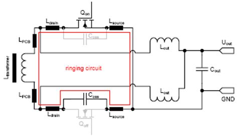 并且,環(huán)路的寄生電阻會抑制振蕩(Coss = MOSFET的輸出電容, Lstray = Lsource + Ldrain + LPCB + Ltransformer)。僅當(dāng)二次側(cè)的環(huán)路電感限制了電流換向時,此處討論的波形形狀才有效。這就意味著,限制di/dt的不是一次側(cè)MOSFET的開啟速度,而是電源的二次側(cè)的雜散電感。