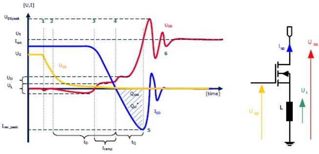 分析首先從開關(guān)的導(dǎo)通狀態(tài)開始:此時,柵極電壓很高,漏源電壓幾乎為零,電流從源極流向漏極。在點(diǎn)1時,柵極被關(guān)斷。在UDS波形中,這表現(xiàn)為柵極電容CG放電產(chǎn)生的負(fù)電壓驟降很小。此放電會在MOSFET的源極連接處產(chǎn)生具有大的電流變化(di/dt)的電流峰值。在感應(yīng)作用下,源極的這種電感會引起UDS波形發(fā)生壓降。