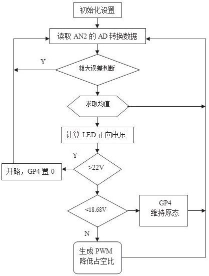 PIC12F675初始設(shè)置GP4輸出高電平,如測得LED正向電壓在合理范圍內(nèi),則維持高電平輸出使LM3404正常工作;如LED正向電壓逐漸變低并低于設(shè)定值18.68V,則在GP4引腳輸出PWM信號,其占空比可依次降低,直至LED正向電壓低于設(shè)定值。當(dāng)測得LED正向電壓很高時可判定輸出開路, PIC12F675可輸出低電平關(guān)閉LM3404的輸出。