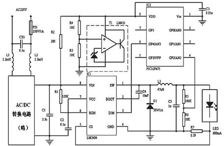 需要指出的是,輸出電壓取樣包含了用于LM3404恒流控制的電流取樣電壓約0.23V,在PIC12F675的計算程序中應(yīng)予以調(diào)整。