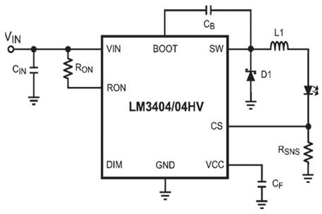 LM3404應(yīng)用十分簡單,一個用LM3404的典型應(yīng)用如圖6所示。