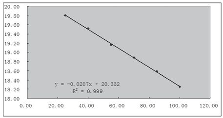 因測試時間較短,可以將測量時恒溫箱設(shè)置溫度近似等于LED光源的結(jié)溫。在600mA恒流的情況下,通過數(shù)學(xué)方法不難得出光源模塊正向電壓與結(jié)溫的關(guān)系。利用Excel工具,以溫度為X軸,平均值為Y軸,生成(X,Y)散點圖,選擇線性回歸分析類型則可生成如下趨勢圖和公式。