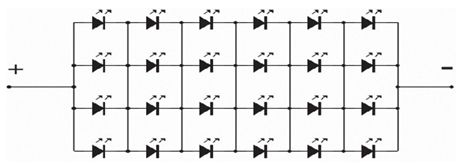 在實際應(yīng)用中,往往不需要確定LED結(jié)溫的特別精確的數(shù)值,此時可以用試驗的方法確定整體燈具LED光源結(jié)溫的估算數(shù)值。以一個12W筒燈為例,光源部分由4并6串中功率LED組成,其電路連接形式如下: