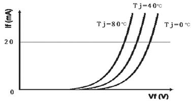LED的伏安特性和其它二極管一樣具有負(fù)溫度系數(shù)的特點,即在結(jié)溫升高時I/V曲線出現(xiàn)左移現(xiàn)象,如下圖所示。