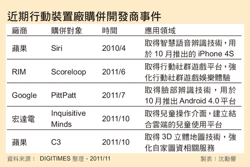 移動裝置市場競爭激烈,蘋果、Google、宏達(dá)電等大廠為凸顯產(chǎn)品獨(dú)特性,購并開發(fā)商成為重要布局。