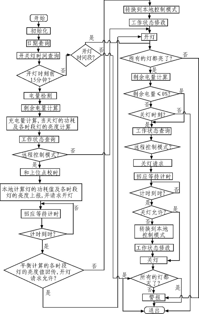 進(jìn)行太陽能路燈電池板電流檢測,蓄電池電壓檢測,蓄電池電量監(jiān)測,以及環(huán)境溫度的檢測,采用光開時(shí)關(guān),并實(shí)時(shí)上傳工作環(huán)境及狀態(tài)數(shù)據(jù),預(yù)警故障,保證系統(tǒng)的可靠性。圖2為太陽能路燈的開、關(guān)控制流程網(wǎng)。