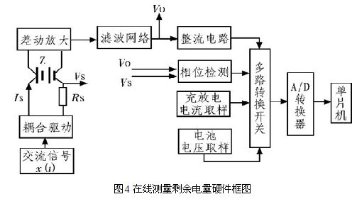 給電池施加一個(gè)固定頻率和固定電流(日前一般使用l kHz頻率、50 mA小電沆),然后對其電壓進(jìn)行采樣,經(jīng)過整流、濾波等一系列處理后通過運(yùn)放電路計(jì)算出該電池的內(nèi)阻值。圖4為在線測量剩余電量硬件框圖。