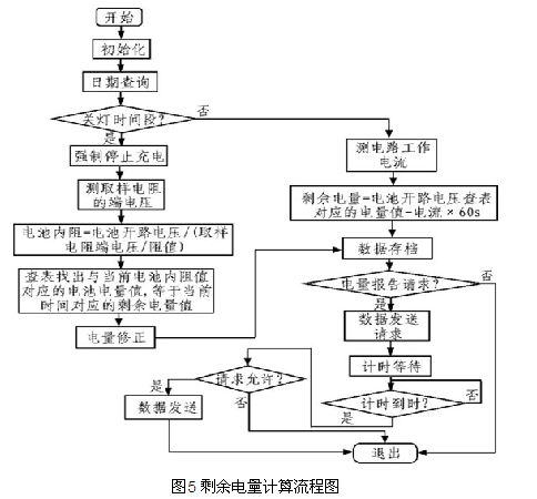 通過計(jì)算電流在時(shí)域上的積分,可得出電量變化值,在路燈工作前檢測到的電池電量作為初始電量,則剩余電量為初始電量減去電量變化值。同時(shí)通過對MPPT電路的輸出電流做積分,作為電量變化的校正值,從而得到較準(zhǔn)確的剩余電量值。圖5為剩余電量計(jì)算流程圖。