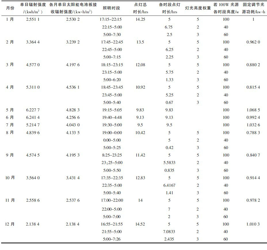 開關(guān)燈的時(shí)間根據(jù)天安門升降旗時(shí)間而定,如表1所示,全年最長點(diǎn)燈時(shí)長茌12月為14.52小時(shí),最短為9.13小時(shí)。照明時(shí)間分為3個(gè)時(shí)段,第一個(gè)時(shí)段從當(dāng)天天安門降旗時(shí)刻開始,為5個(gè)小時(shí),第二個(gè)時(shí)段到早上5點(diǎn),第三個(gè)時(shí)段從5點(diǎn)到滅安門升旗時(shí)刻,燈光亮度各時(shí)段權(quán)重比為5:2:3,如果以100 W光源為設(shè)計(jì)標(biāo)準(zhǔn),則光源功耗最大為1.068 5 kW-h。