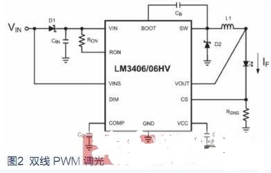 雙線PWM調(diào)光是用于汽車內(nèi)部照明的常見方法。當VIN被調(diào)制為低于 VIN-NOMINAL的 70% 時,VINS引腳(圖2)檢測電壓的變化,并將PWM波形轉(zhuǎn)換為和輸出驅(qū)動電路相應(yīng)的PWM。這種方法的缺點是轉(zhuǎn)換器的電源必須包含一個電路,以便為其直流輸出提供 PWM 波形。