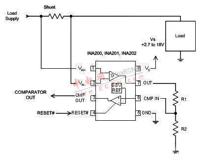 在許多應用中,電流應與某個設定值相比較。通常說來,進行電流比較還需要電流分路.、比較器和參考電壓。此外,理想的比較器輸出應與大多數常見的邏輯電路很好地兼容。圖 5 給出了電流比較的例子。在本例中,將電流與采用 TI INA200 系列電流分路.和比較器的簡單單電壓結點進行了比較。R1 和 R2 形成分壓器,以根據 INA200 系列比較器的內置 0.6V 電壓結點來設置電壓結點。(INA200 系列的增益很有特點:INA200 的增益為 20,INA201 的增益為 50,INA202的增益為 100。)