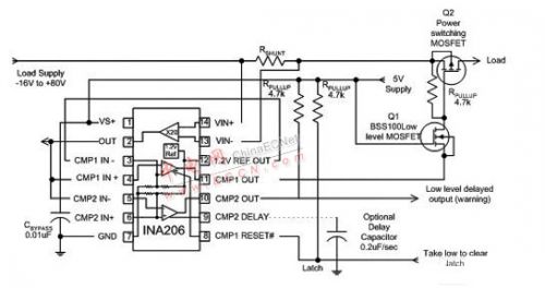 圖 6 顯示了電流與兩個電壓結點比較的電路。較低的電壓結點激活警報輸出,我們可為其配置一個適當的延遲電路,以避免錯誤的瞬態(tài)觸發(fā)。較低的電壓結點在比較器輸入端內置閾值為 0.6V。Q1 為較高電壓結點輸出提供緩沖,通過電源開關 MOSFET 關閉電源,如果電流超過上限則啟用 Q2。較高電壓結點采用 INA206 的 1.2V 參考電壓,INA206 具有避免在沒有鎖存功能的電壓結點發(fā)生振蕩的鎖存功能。