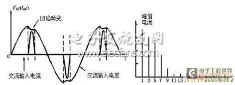 (a) 電網(wǎng)輸入端電流和電壓的畸變 (b)峰值電流中的各次諧波分量頻譜