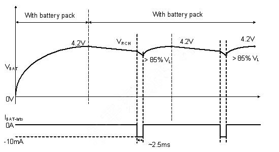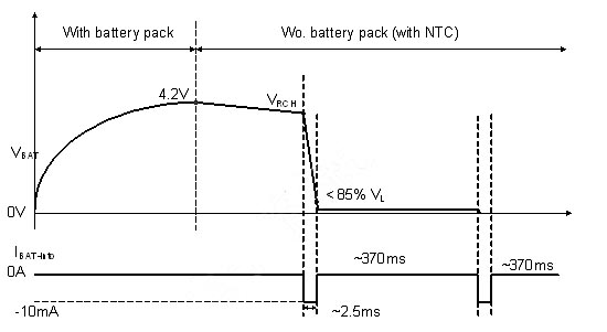 使用者亦有可能在充電或式充電完畢后,在未將電源移除的情況下,即抽離電池的情況。為避免造成危險(xiǎn),IC內(nèi)部應(yīng)具有如圖7, 8的電池存在偵測(cè)機(jī)制。充電IC會(huì)以短時(shí)間脈沖(每370ms產(chǎn)生2ms的脈沖)方式抽取電池電流,此時(shí)若電池存在,則偵測(cè)到的電池電壓應(yīng)大于一預(yù)設(shè)閥值;若電池已切離,則充電IC偵測(cè)到一低電壓,即可判定為電池?cái)嚅_(kāi)狀態(tài),并將電池端電壓切斷,保護(hù)使用者安全。