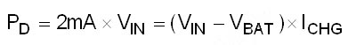假設(shè)使用5.5V電源供應(yīng)器對(duì)單顆1200mAh鋰離子電池進(jìn)行充電,在0.7°C快速充電電流時(shí),且電池電壓為3V的條件下,可以預(yù)估IC運(yùn)作的最大耗電量為,1.762W的耗電最大值,此一功耗會(huì)使得熱阻抗60°C /W的3×3毫米QFN封裝溫度溫升127°C,即便環(huán)境溫度0°C時(shí),也已經(jīng)超過(guò)所允許的125°C硅晶片操作溫度最大值。若設(shè)定充電電流為0.6A(0.5C),則可降低IC溫升為90度,可以操作于35度的環(huán)境溫度中,因此是較佳的設(shè)定電流。