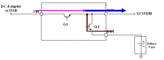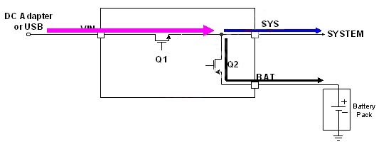 LD6275具有適應(yīng)性電源路徑管理(Adaptable Power Path Management, APPM)功能,其為以供給系統(tǒng)端用電為主,對(duì)電池充電為輔,如圖3所示;當(dāng)系統(tǒng)用電超過(guò)輸入電源的供給限制時(shí),其電池亦能主動(dòng)開(kāi)啟放電功能同時(shí)對(duì)系統(tǒng)端供給其所需之電能需求,如圖4所示。
