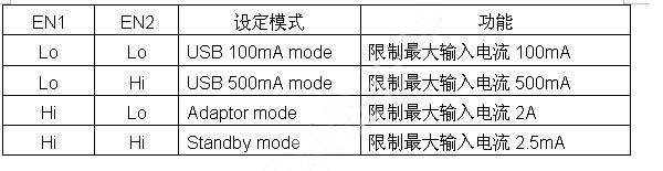 LD6275將電源適配器/USB埠的5V直流電源進(jìn)行降壓穩(wěn)流,對(duì)鋰離子電池進(jìn)行充電,為防止電源適配器的過(guò)電流超載,可以外部電阻RCISET設(shè)定最大充電電流限制。同時(shí)支援電腦USB埠充電模式,并依據(jù)外部腳位EN1與EN2進(jìn)行設(shè)定,各模式請(qǐng)見(jiàn)表1.透過(guò)為USB 500mA與USB 100mA操作模式設(shè)定,可以保護(hù)PC端USB埠避免過(guò)載。