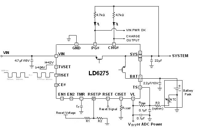 為滿(mǎn)足低耗電可攜式產(chǎn)品對(duì)于更精確、更安全的充電器應(yīng)用需求,許多IC制造商發(fā)展出低成本線(xiàn)性充電器。圖2是以通嘉科技的LD6275充電IC為設(shè)計(jì)范例,構(gòu)成僅需少數(shù)外部零件的獨(dú)立式線(xiàn)性充電器電路,其具備1.5A的最大充電電流。