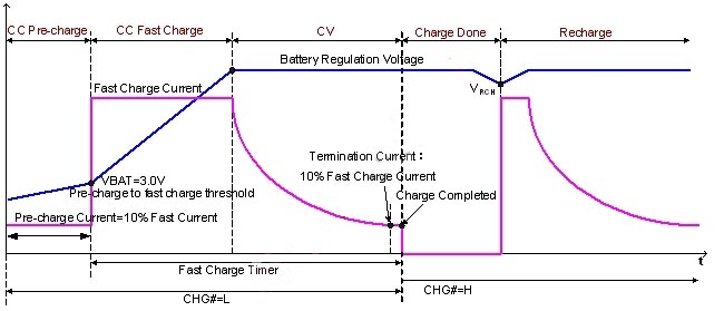 在快充模式下,電池的電壓以較高速度上升,升高至4.2V時(shí),切換至4.2V的定電壓充電,由電池本生的內(nèi)阻進(jìn)行限流,此時(shí)充電電流就如同圖1的CV階段。隨著時(shí)間過(guò)去,充電電流呈現(xiàn)指數(shù)曲線(xiàn)遞減,當(dāng)?shù)竭_(dá)設(shè)定電流ICHG的10%,即關(guān)閉充電器,同時(shí)指示充電完成。