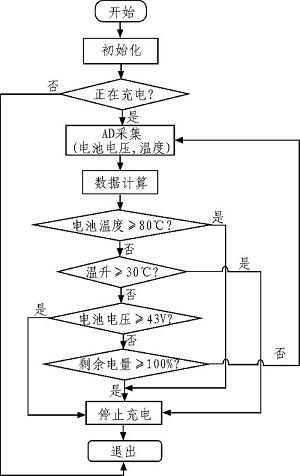 采用充電限壓,電池溫升檢測策略,如蓄電池電36 V,充電截止電壓42.5-43 V,充電截止溫度80℃,充電截止溫升30℃。不過絕大部分時(shí)間蓄電池基本處于欠充狀態(tài)。同時(shí)通過對(duì)電池電壓的數(shù)據(jù)實(shí)時(shí)采集,利用軟件控制對(duì)電池采取限壓保護(hù):通過實(shí)時(shí)計(jì)算電池電量進(jìn)行防過充過放保護(hù),電量為100%時(shí)停止充電,電量為20%時(shí)停止放電,為延長其壽命,做了第二道防線。圖1 為蓄電池過充保護(hù)流程圖。