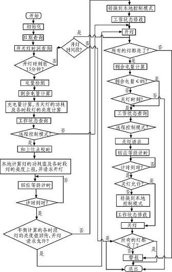 進(jìn)行太陽能路燈電池板電流檢測,蓄電池電壓檢測,蓄電池電量監(jiān)測,以及環(huán)境溫度的檢測,采用光開時(shí)關(guān),并實(shí)時(shí)上傳工作環(huán)境及狀態(tài)數(shù)據(jù),預(yù)警故障,保證系統(tǒng)的可靠性。圖2為太陽能路燈的開、關(guān)控制流程網(wǎng)。