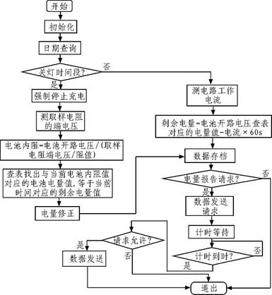 通過計(jì)算電流在時(shí)域上的積分,可得出電量變化值,在路燈工作前檢測到的電池電量作為初始電量,則剩余電量為初始電量減去電量變化值。同時(shí)通過對(duì)MPPT電路的輸出電流做積分,作為電量變化的校正值,從而得到較準(zhǔn)確的剩余電量值。圖5為剩余電量計(jì)算流程圖。