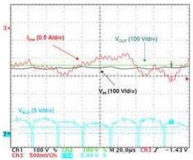 因此,輸出電壓呈現(xiàn)出輸入線路頻率2倍的低頻交流含量。不利的是,PFC電流整形(current-shaping)方法均基于控制信號(hào)無(wú)紋波的假設(shè)。否則,就不能夠優(yōu)化功率因數(shù),因?yàn)檩斎刖€路電流重新復(fù)制了控制信號(hào)失真。這就是眾所周知的PFC電路動(dòng)態(tài)性能差的原因。它們的穩(wěn)壓環(huán)路帶寬設(shè)得極低,從而抑制100Hz或120Hz紋波,否則輸出電壓就會(huì)注入這紋波。