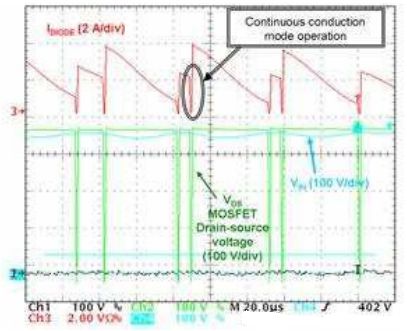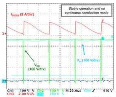 圖4顯示出現(xiàn)不穩(wěn)定性問(wèn)題時(shí)高輸入線路(正弦波頂端,此處Vin約為380V)下的VAUX電壓。我們可以看到MOSFET關(guān)閉時(shí),VAUX電壓輕微躍升至高于ZCD閾值。由于其大紋波的緣故,在退磁相位期間,VAUX電壓首先增加,然后下降。由于在某些開(kāi)關(guān)周期的末段VAUX接近ZCD閾值,這VAUX電壓下降導(dǎo)致零電壓比較器在電感磁芯完全復(fù)位前就翻轉(zhuǎn)(trip)。圖5證實(shí)了這一論斷。有時(shí),升壓二極管仍在導(dǎo)電時(shí),PFC段開(kāi)始新的周期。這個(gè)現(xiàn)象主要導(dǎo)致線路電流失真(見(jiàn)紅色跡線)、功率因數(shù)退化,并可能有一些頻率處在人耳可聽(tīng)到的噪聲。