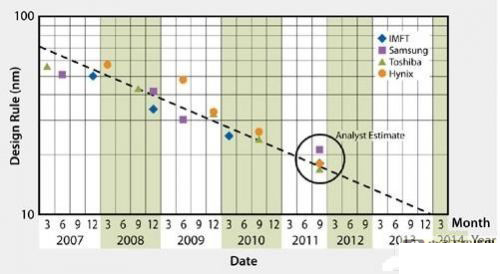 圖1:NAND閃存技術(shù)的制造工藝幾何尺寸變化趨勢(shì)。