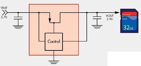 對(duì)于低速工作的小容量SD卡,耗電量常常小于100mA。假設(shè)鋰離子電池的額定工作電壓為3.7V,且存儲(chǔ)器的電源軌相當(dāng)高,則線性調(diào)節(jié)器就成為SD存儲(chǔ)器的電源選擇。不過,選定的線性調(diào)節(jié)器必須能以低壓降(LDO)方式工作,因?yàn)殇囯x子電池的有效電壓范圍在3.2至4.2V之間。